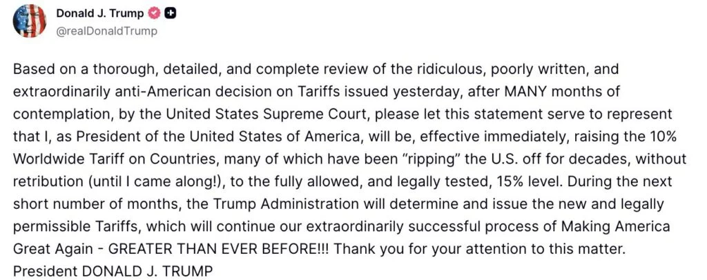 In a post on Truth Social, Trump said the higher tariff would take effect “immediately,” framing the move as a response to what he called a flawed Supreme Court decision.
