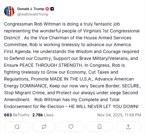 “Rob Wittman has my Complete and Total Endorsement for Re-Election — he will never let you down!” Trump concluded, using the familiar phrasing he often reserves for loyal allies in Congress.
